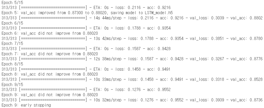 - 훈련 과정에서 검증 데이터의 정확도가 가장 높았을 때 저장된 모델인 'LSTM_model.h5' 로드