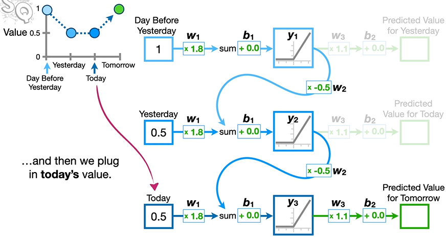 ② 어제의 값을 입력값에 넣고 w1, b1 activation function으로 중간값 y1 구함