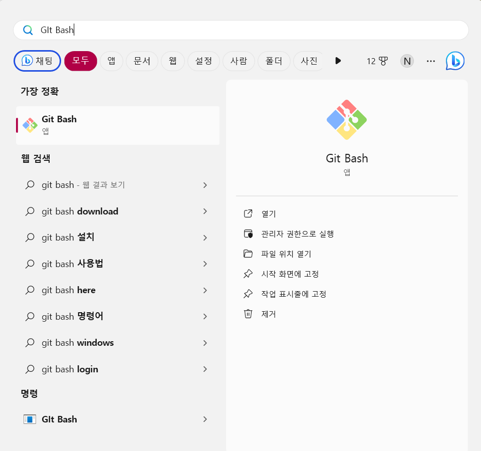 제대로 깃이 설치되었는지 확인하려면 윈도우 검색창에서 'Git Bash' 검색
