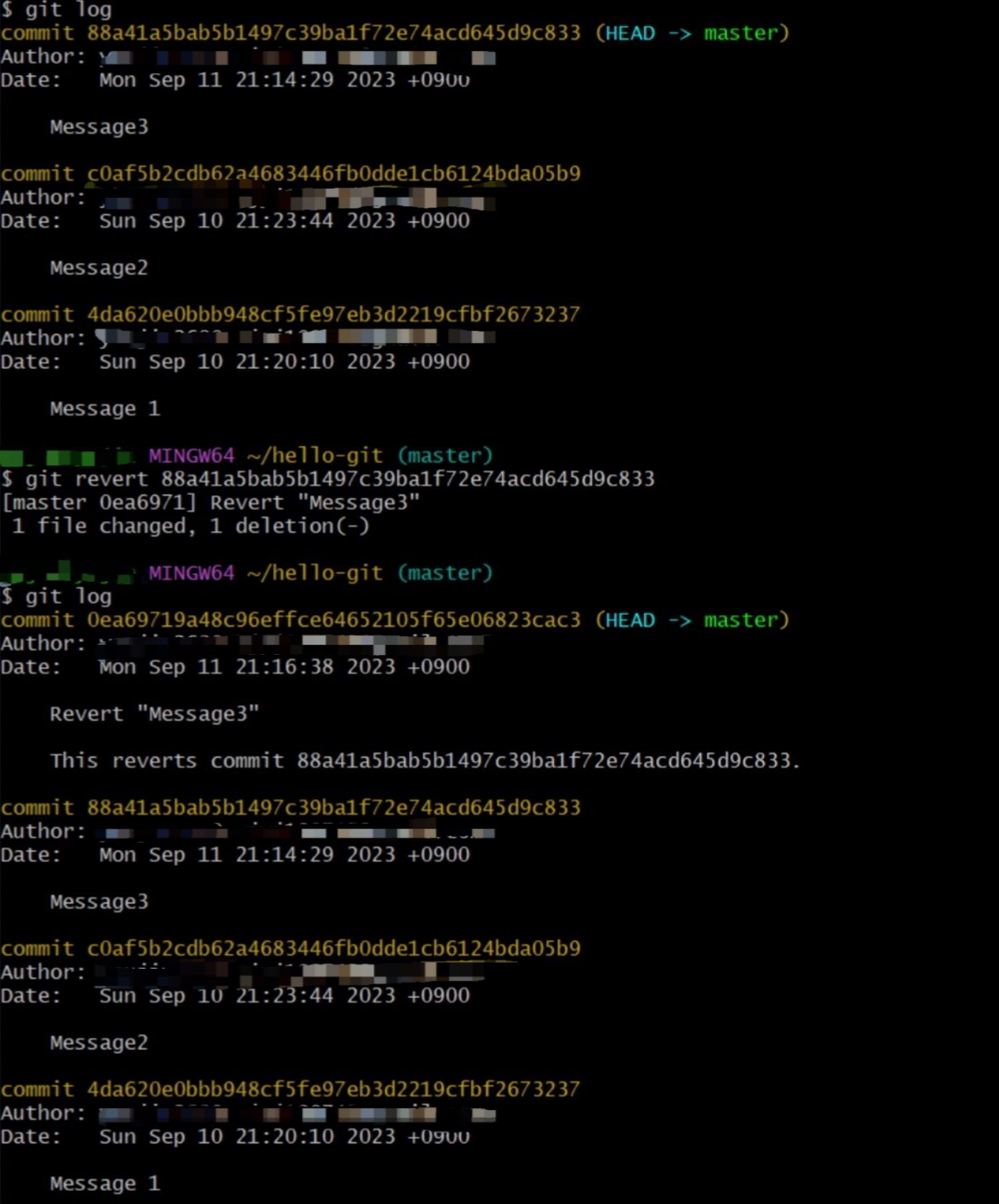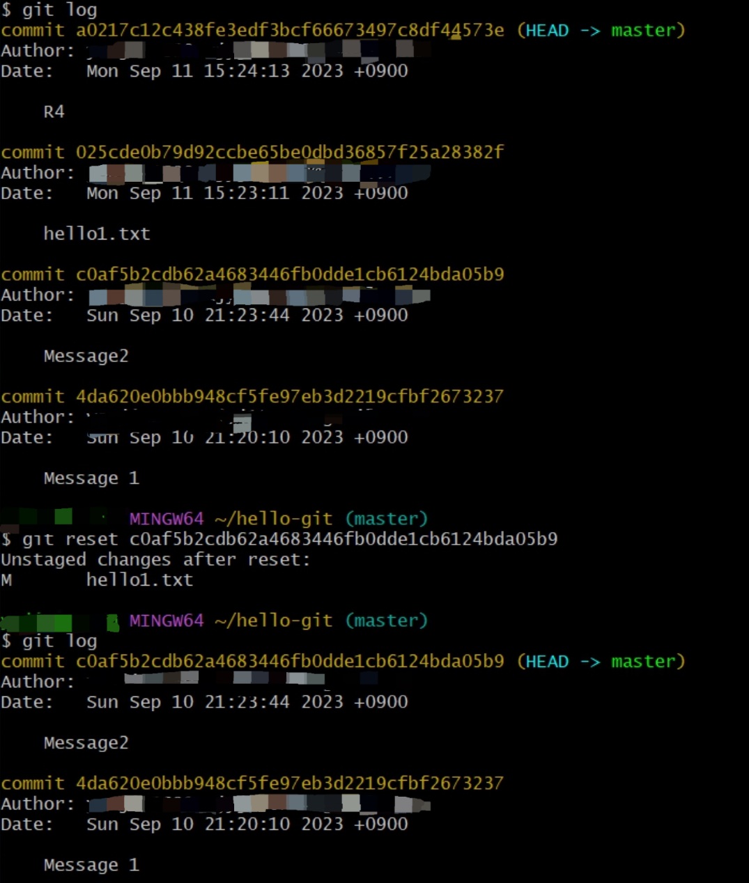- 'hello1.txt' 파일에서 "Message3" 커밋한 후 최신 커밋 되돌리려면,