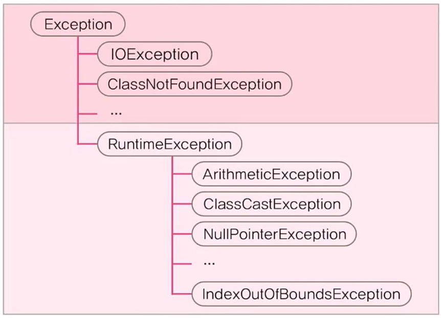 - 예외 : 코드에 의해 수습될 수 있는 미약한 오류(Exception, RuntimeException 등)