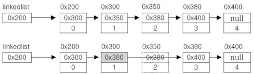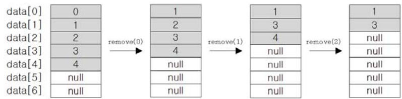 - 삭제할 데이터 아래의 데이터를 한 칸씩 위로 복사해서 삭제할 데이터를 덮어씀(마지막 데이터의 경우 이 과정 필요 없음)