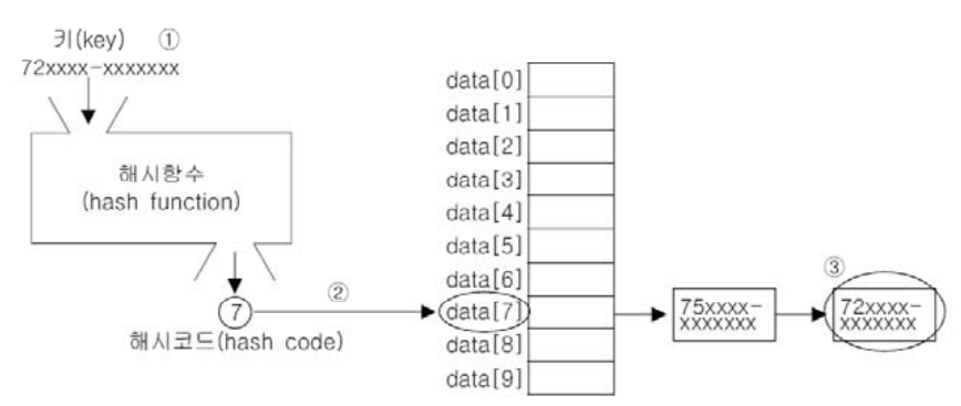 : 해시함수(hash function)로 해시 테이블에 데이터를 저장, 검색