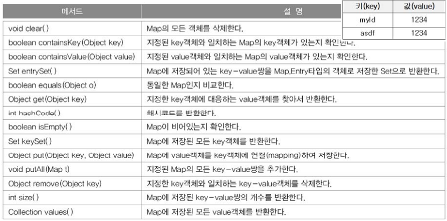 - 구현클래스 : HashMap, TreeMap, Hashtable, Properties 등
