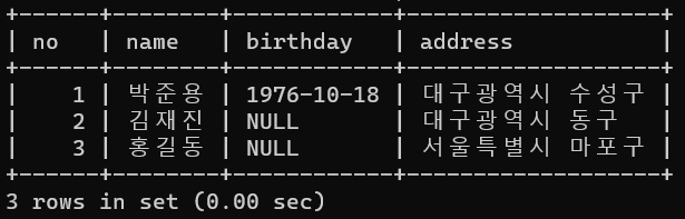 - NULL 데이터 : 값이 없는 데이터