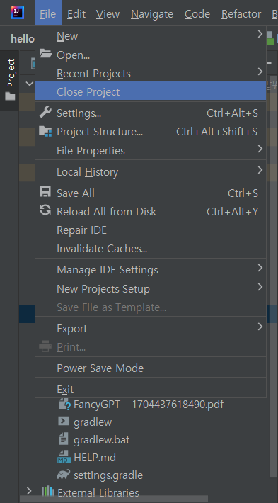 1. File -> Close Project