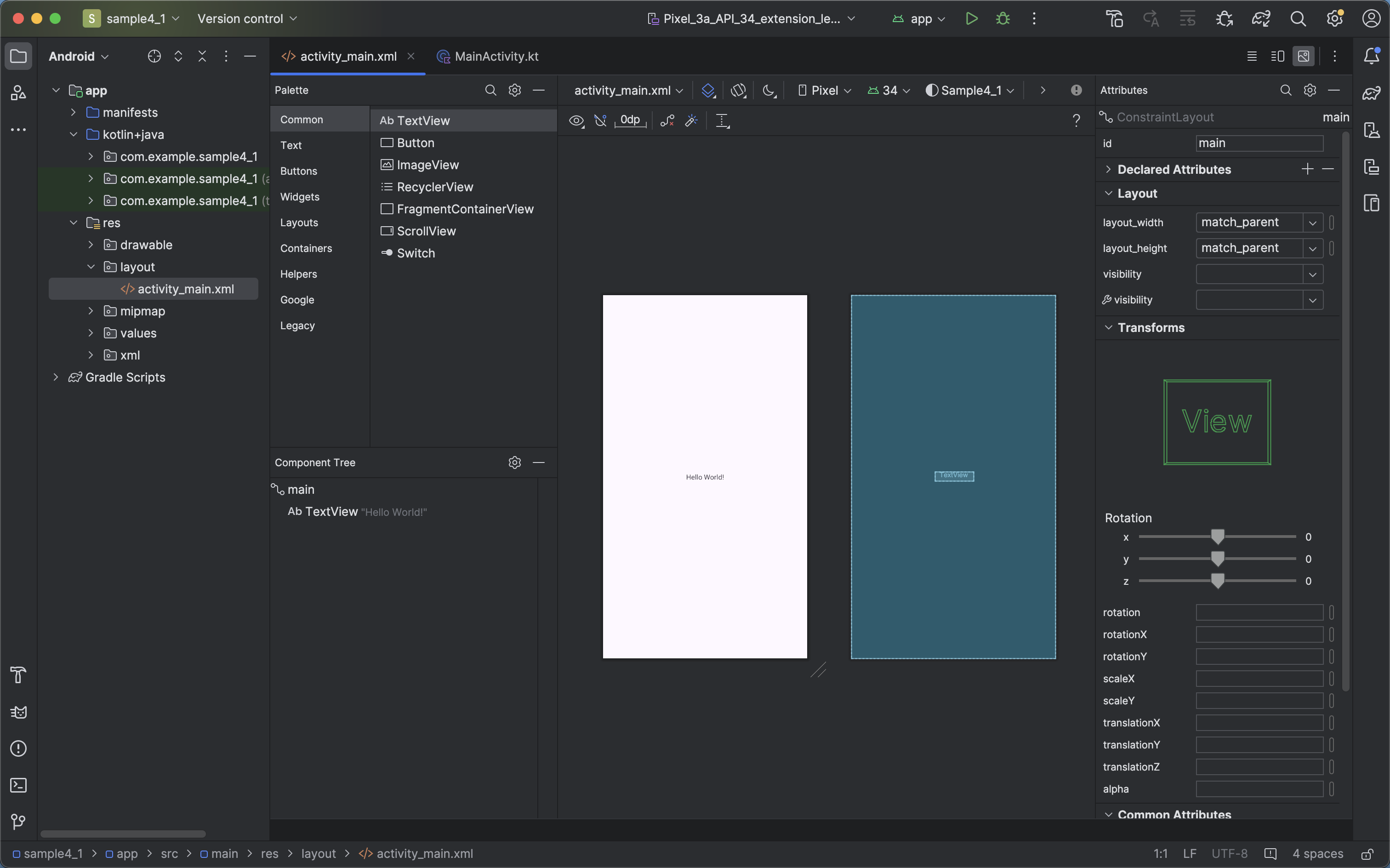 : acitivity_main.xml 화면에 버튼이나 이미지 등의 요소를 배치하고 MainActivity.kt 파일에 코드를 작성하여 기능을 구현한다.