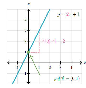 : x 값이 증가할 때 y 값이 어느 정도 증가하는지에 따라 그래프가 기울어진 정도