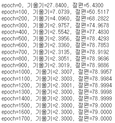print("epoch=%.f, 기울기=%.04f, 절편=%.04f" % (i, a, b))