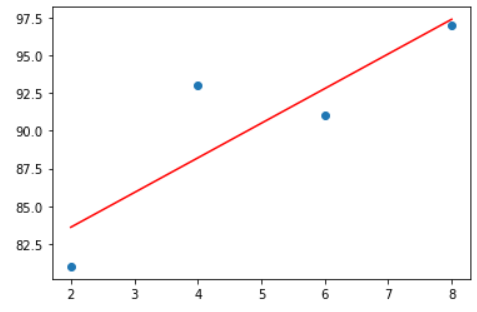 - 최소 제곱법으로 계산한 결과, a = 2.3, b = 79