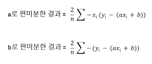 - 평균 제곱 오차의 식을 각각 a와 b로 편미분