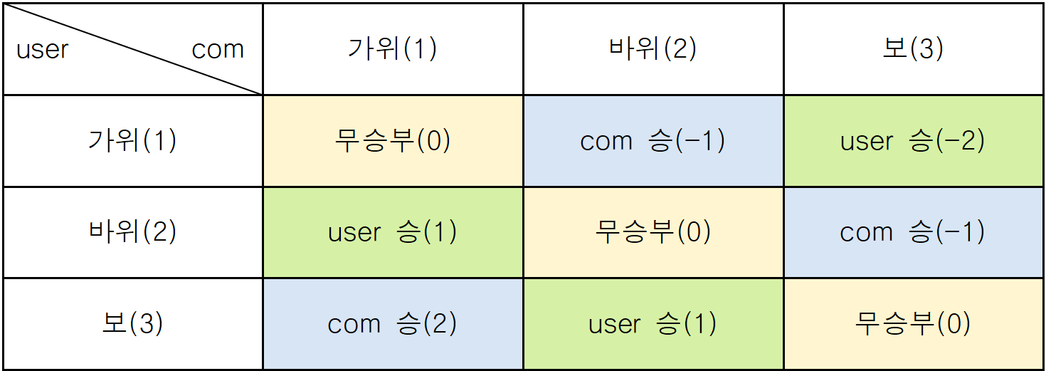 | - 조건식 : user - com - if 조건식 값 == 1 or -2, user 승 else if 조건식 값 == 2 or -1, com 승 else, 무승부 |