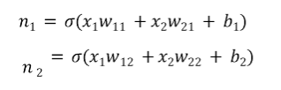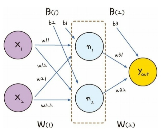 : 입력 값인 x1과 x2에 각각 가중치(w)를 곱하고 바이어스(b)를 더해 은닉층(node)으로 전송