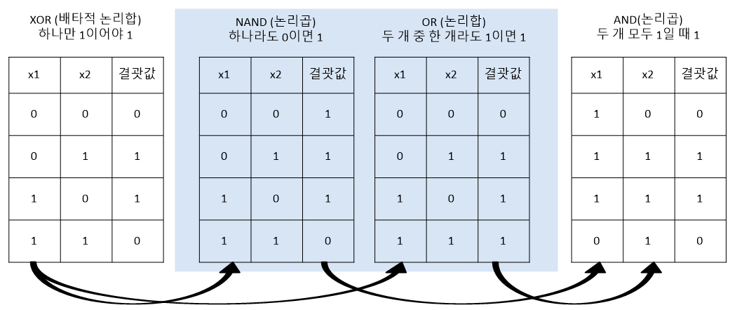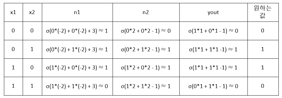 - 퍼셉트론 두 개를 각각 처리하는 은닉층을 만들어 두 개를 한 번에 계산하면 XOR 문제 해결 가능