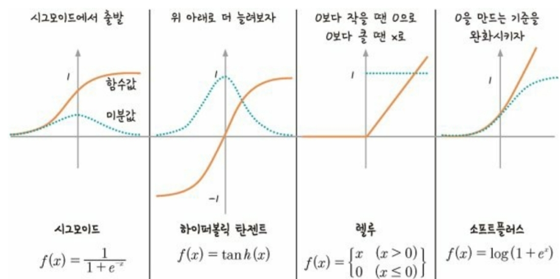 - 해결책 : 활성화 함수로 시그모이드가 아닌 다른 함수 탐색