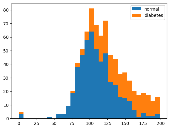 plt.hist(x=[df.plasma[df.diabetes==0], df.plasma[df.diabetes==1]], bins=30, histtype='barstacked', label=['normal','diabetes'])