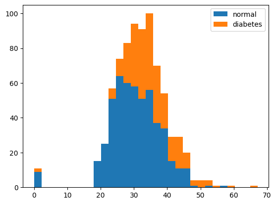 plt.hist(x=[df.bmi[df.diabetes==0], df.bmi[df.diabetes==1]], bins=30, histtype='barstacked', label=['normal','diabetes'])
