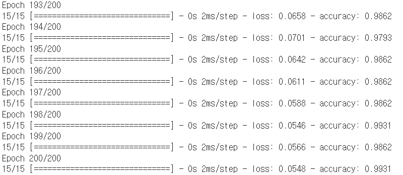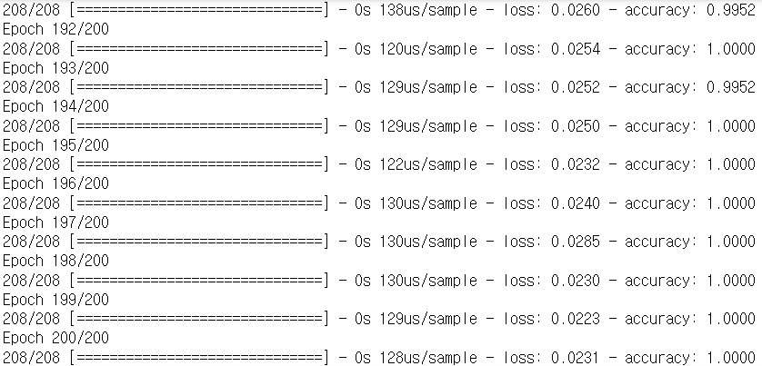 history=model.fit(X_train, y_train, epochs=200, batch_size=10)