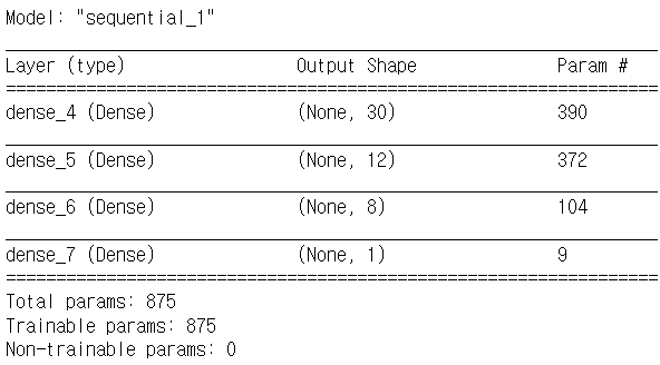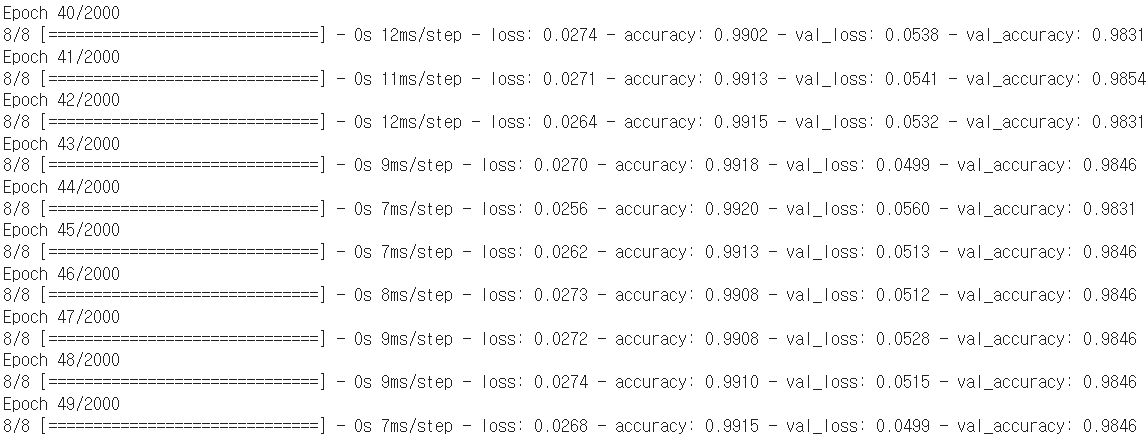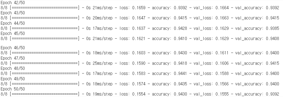 - metrics : accuracy 지정하면 accuracy(정확도) 출력 / 검증셋 지정하면 val_accuracy(검증셋으로 얻은 정확도) 값도 출력