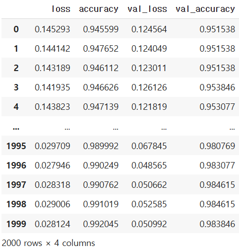 - history.history : loss, accuracy, val_loss, val_accuracy 들어있음