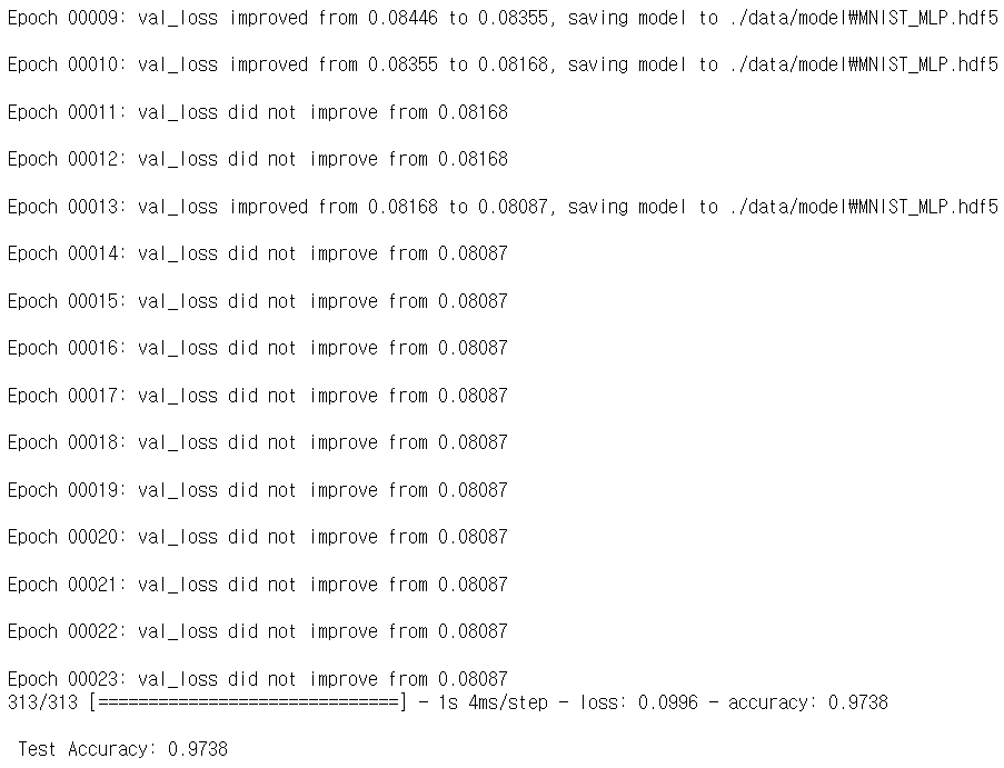 - 10번 이상 모델 성능이 향상되지 않으면 자동으로 학습 중단