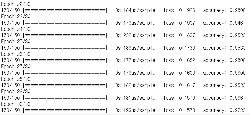 history=model.fit(X, y, epochs=30, batch_size=5)